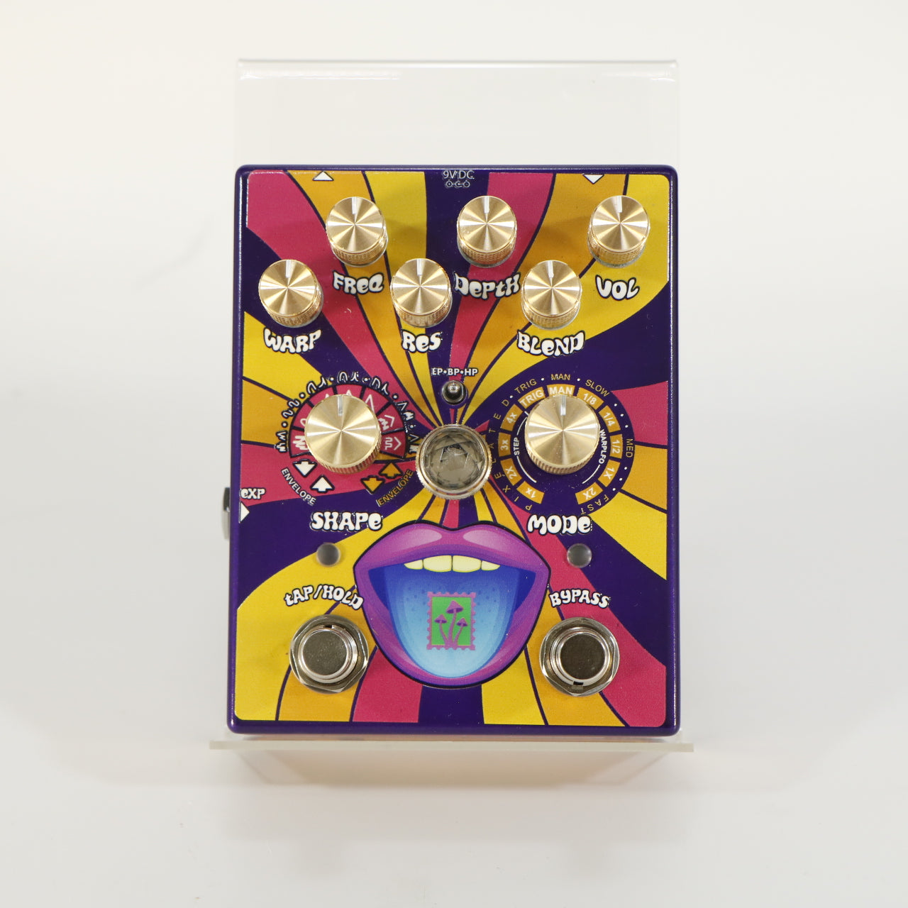 Front-panel controls include Blend (to smoothly mix dry and wet signal), Volume for output level, Depth to adjust filter intensity, Resonance for peak emphasis, Frequency for cutoff adjustment, and Warp to tweak modulation behavior. Two footswitches provide true bypass engagement and tap/hybrid functionality depending on the selected mode.