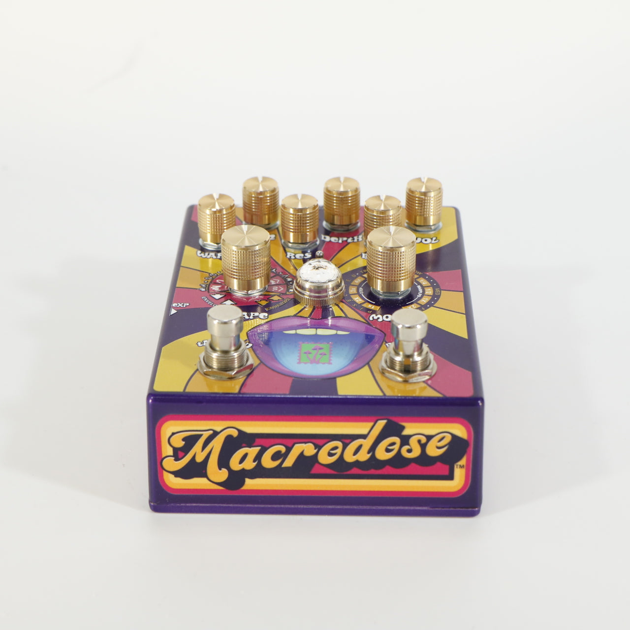 The Macrodose Envelope Filter is a feature‑rich analog filter pedal with digital control, designed in collaboration with Brian Marshall of Subdecay. It offers 11 distinct operating modes—including analog and reverse envelopes, step-triggers, sample/hold, pixelated envelope and LFO-driven shaping—selectable via a mode switch. A separate Shape control lets you choose among seven LFO waveforms such as sine, triangle, saw and random, enabling deep control over modulation character.