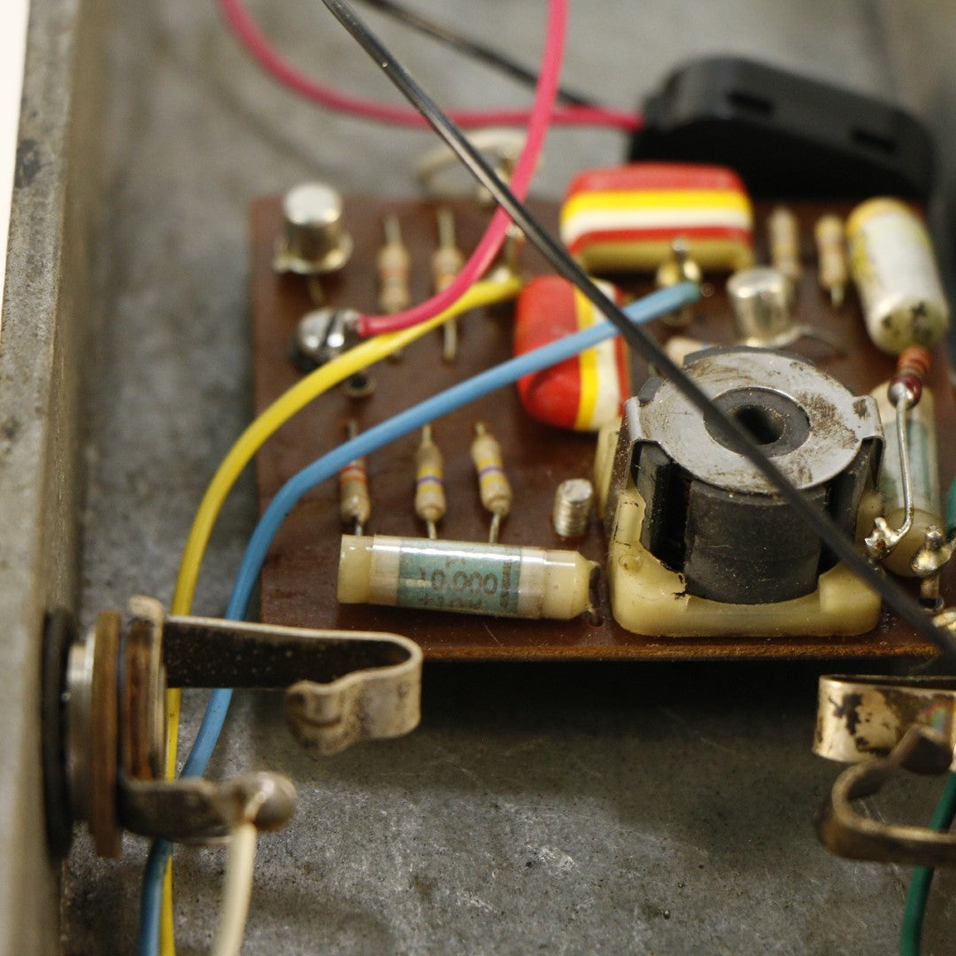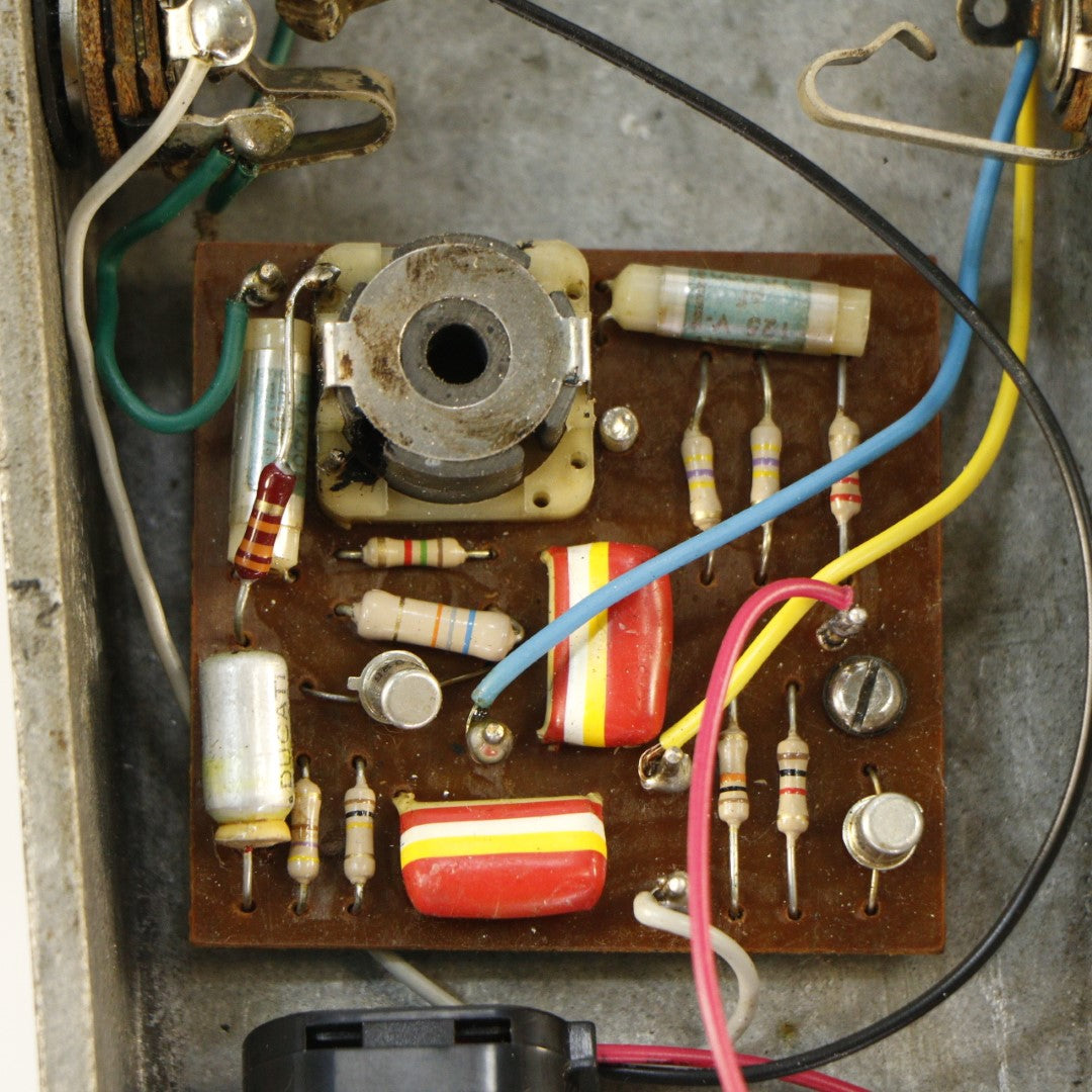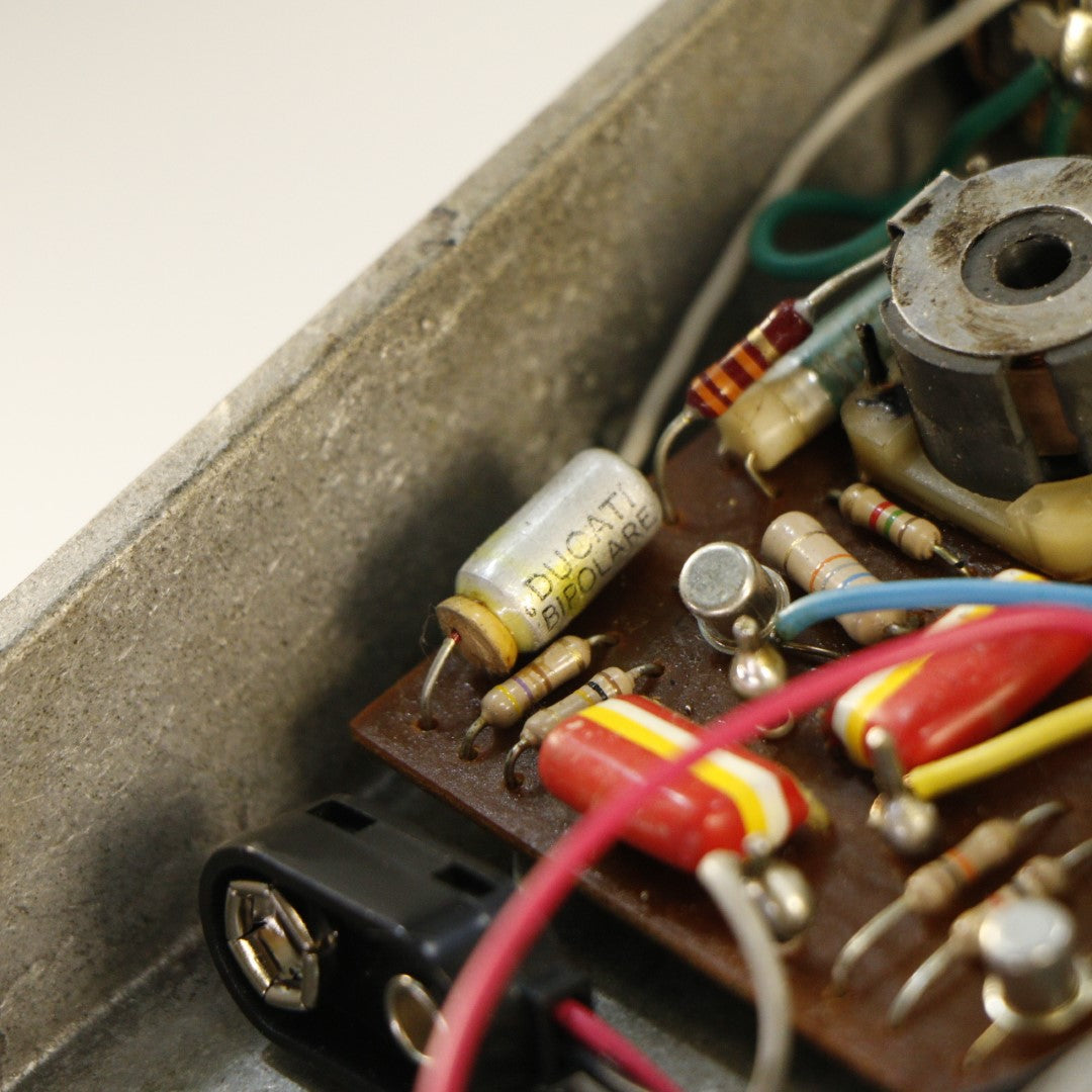 Uiterst zeldzaam en verzamelbaar. De heilige graal van wah pedalen. Tropical fish condensatoren, halo spoel, Ducati Bipolare condensator. Metal can BC109 transistors. Door ons geschat op 1967-1969 op basis van de interne onderdelen. Met mosterdgele tas (productie jaar hiervan is onbekend).
