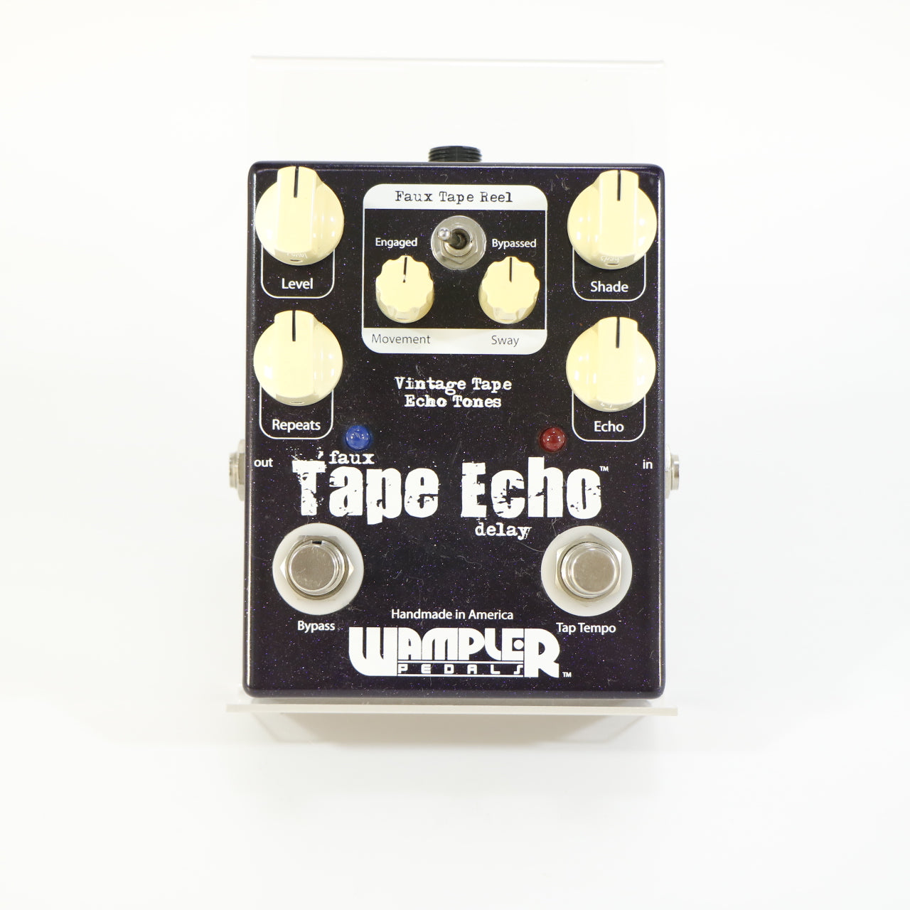 The Wampler Faux Tape Echo Delay is a hand-built, hybrid delay pedal made in the USA. It combines an entirely analog dry-signal path with a digital delay engine to deliver warm, tape-like repeats without degrading your core tone. The controls include Level (delay mix), Repeats (feedback amount), Shade (tone color from warm/dark to bright/clear), and Echo (delay time). There is also a Faux Tape Reel toggle switch to engage or bypass the modulation effect, plus the additional Movement (modulation rate) and Sway (modulation depth) knobs. When the modulation is engaged, you can precisely shape how the echoes wobble and flutter. With delay times reaching approximately 800 ms and relay true-bypass switching, the pedal offers both studio-grade tone and stage reliability.